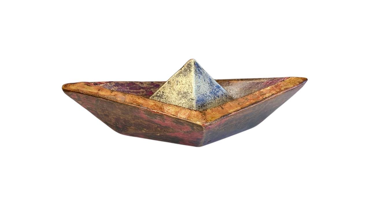 Inspirado en las figuritas de papel que marcaban la infancia, este barquito de barro ha sido modelado y pintado a mano con un acabado envejecido que lo vuelve objeto de memoria. Una pieza que no navega mares, pero sí emociones.