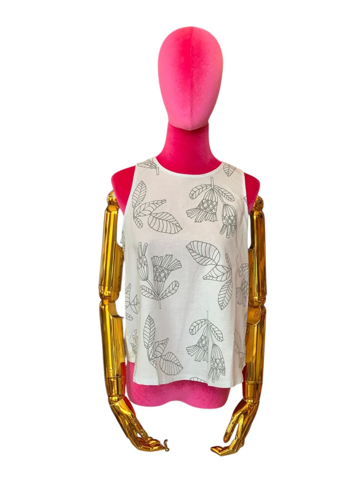 Fresca y cómoda, esta blusa sin mangas en tono claro tiene un delicado estampado floral en líneas finas. Ideal para un estilo natural, casual y versátil.