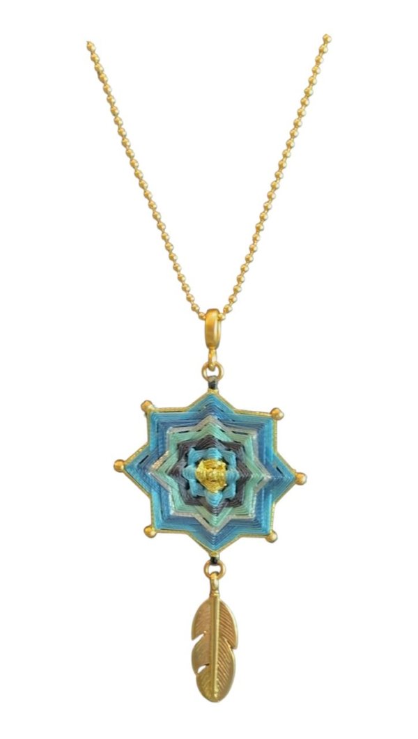 Una estrella tejida en tonos verdes y azulados evoca la profundidad de los bosques y la calma de los cielos. En su centro, un detalle dorado resplandece como el corazón de la naturaleza. Termina con una pluma que simboliza el movimiento libre del espíritu. Un amuleto que acompaña con elegancia y fuerza sutil.
