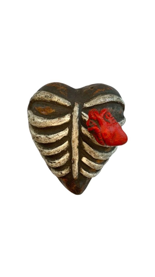Una pieza decorativa que evoca la delicadeza de lo que protege y lo que late. Hecha en forma de caja torácica, con un corazón rojo que palpita en su centro, este objeto no busca adornar, sino decir algo sin palabras: aquí hay vida, memoria y fuerza.