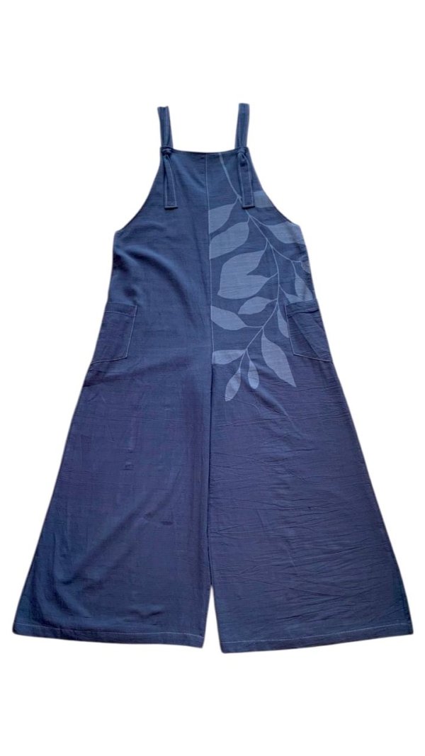 Este palazzo fluye con ligereza y amplitud, confeccionado en una tela suave de tono azul profundo. El diseño de hojas al costado rompe con la uniformidad y aporta un detalle visual que evoca naturalidad y movimiento. Ideal para caminar cómoda y sentirte libre, sin renunciar al estilo.