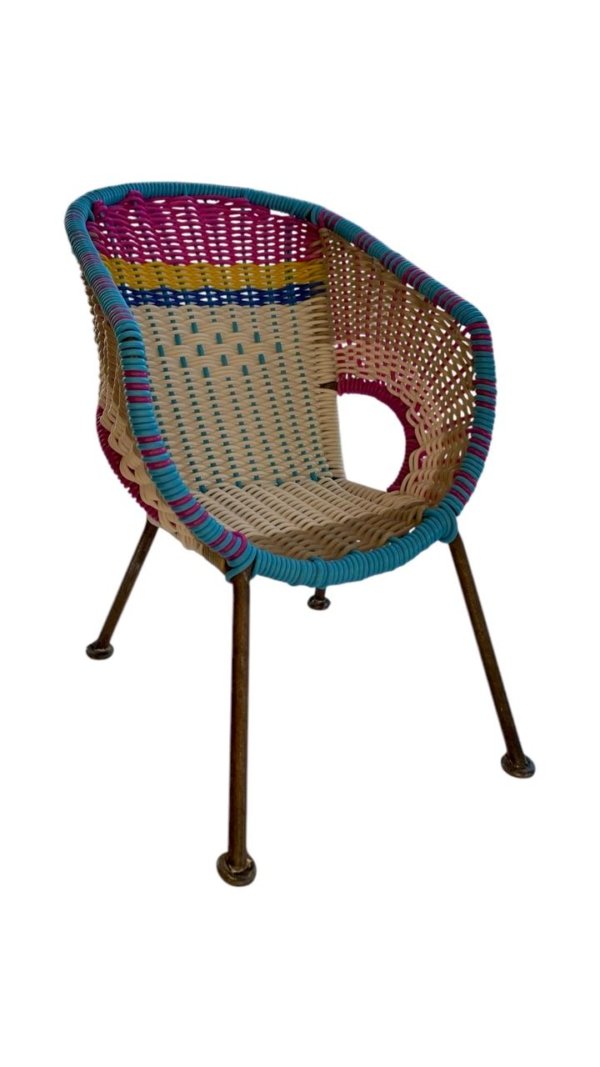 Colorida y firme, esta silla evoca tardes largas bajo el sol y conversaciones que se alargan sin prisa. El tejido artesanal abraza el cuerpo como si supiera exactamente dónde apoyar la nostalgia. Su estructura de metal contrasta con la calidez de los hilos, creando un diálogo entre tradición y diseño moderno.