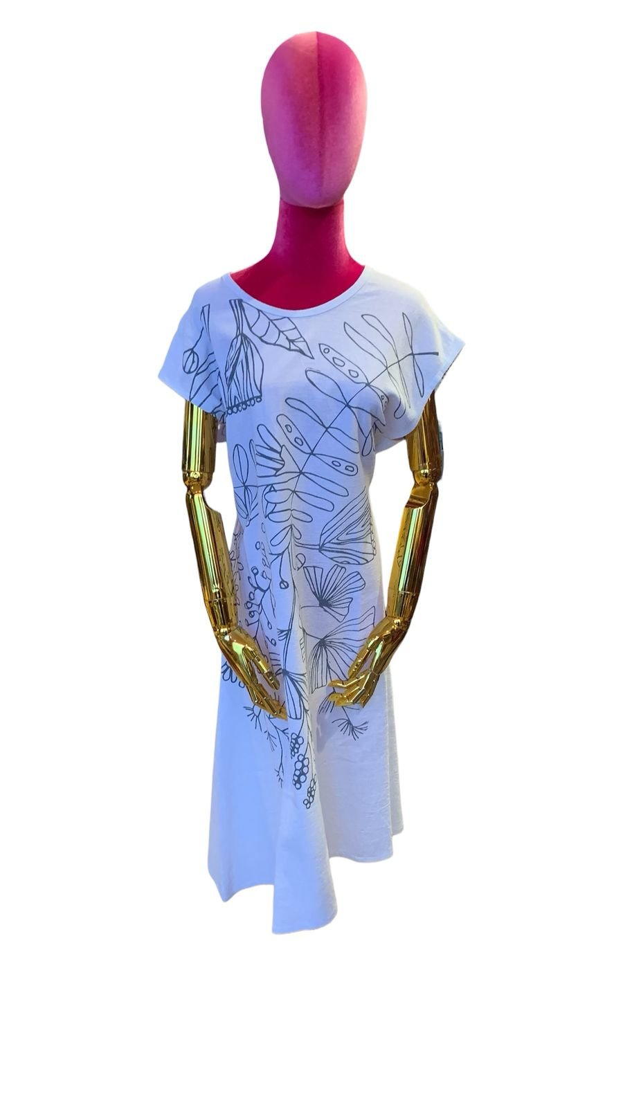 Este vestido blanco largo destaca por su silueta cómoda y su diseño gráfico: un dibujo a línea suelta inspirado en la naturaleza que fluye de forma orgánica por el frente. Perfecto para los días de sol, tiene una vibra ligera y actual que se adapta tanto a lo casual como a lo creativo.