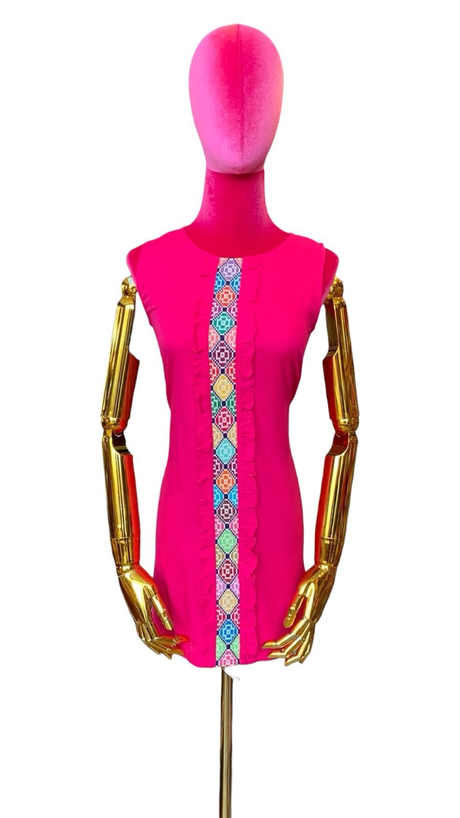 Esta blusa sin mangas apuesta por el contraste: una silueta limpia en fucsia vibrante, interrumpida al centro por una cinta tejida en telar de cintura con figuras geométricas multicolores. Los pequeños holanes añaden textura sin recargar. Una pieza versátil que celebra lo hecho a mano con un estilo moderno.